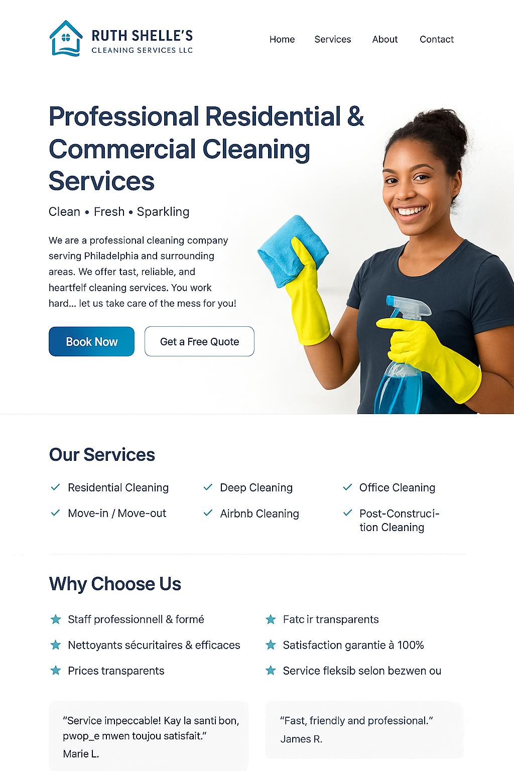 Contact Vous souhaitez un devis ou prendre rendez-vous ? Nous serons ravis de vous aider. Téléphone : 12672317399 ( message texte ) ( message Whatsapp ) Email : edrice2026@gmail.com Localisation : Philadelphia, PA Nous offrons : – Nettoyage résidentiel – Nettoyage commercial – Airbnb / Move-in & move-out – Deep cleaning – Services personnalisés selon vos besoins Cleaning
